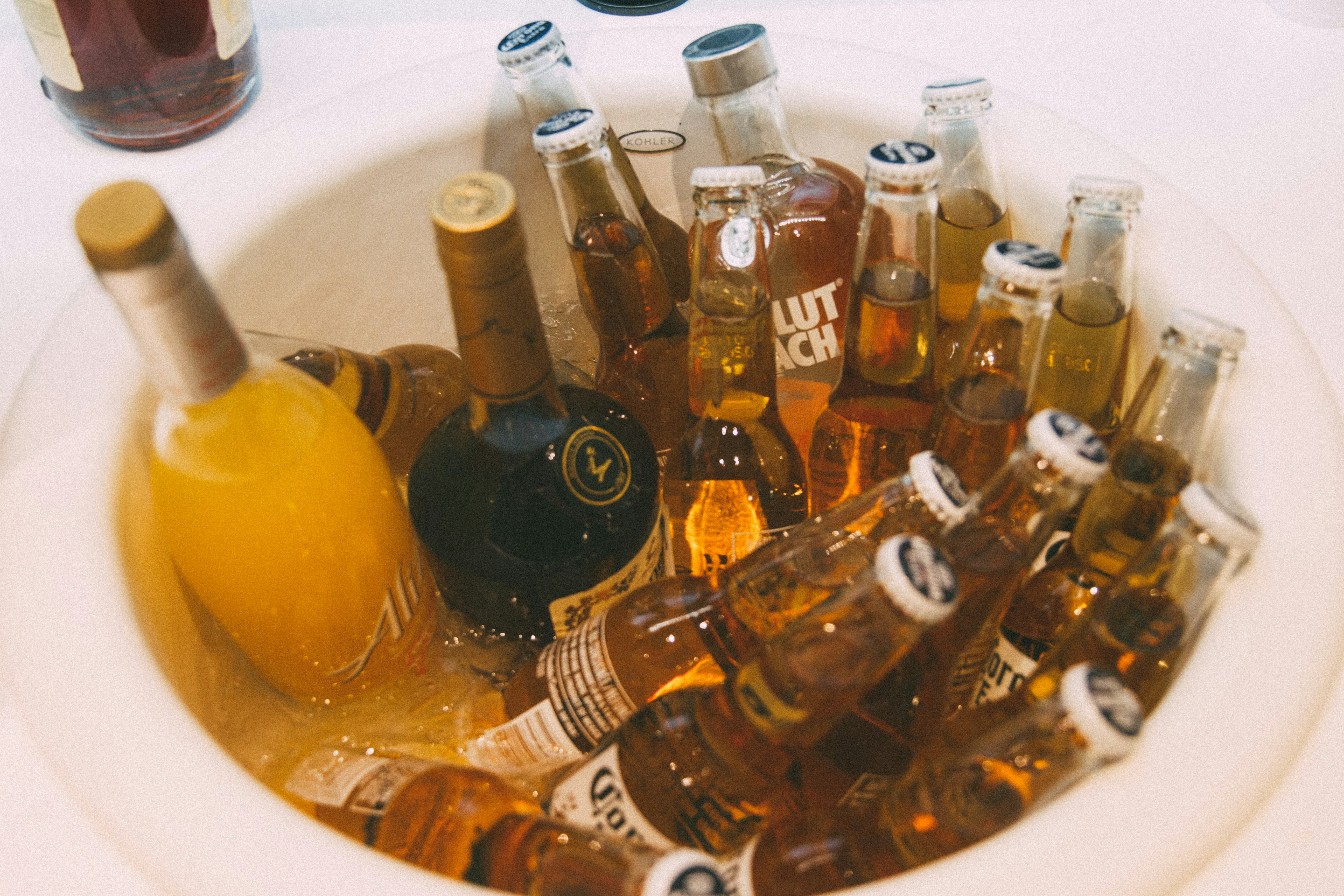 a bunch of beer bottles in a bowl on a table