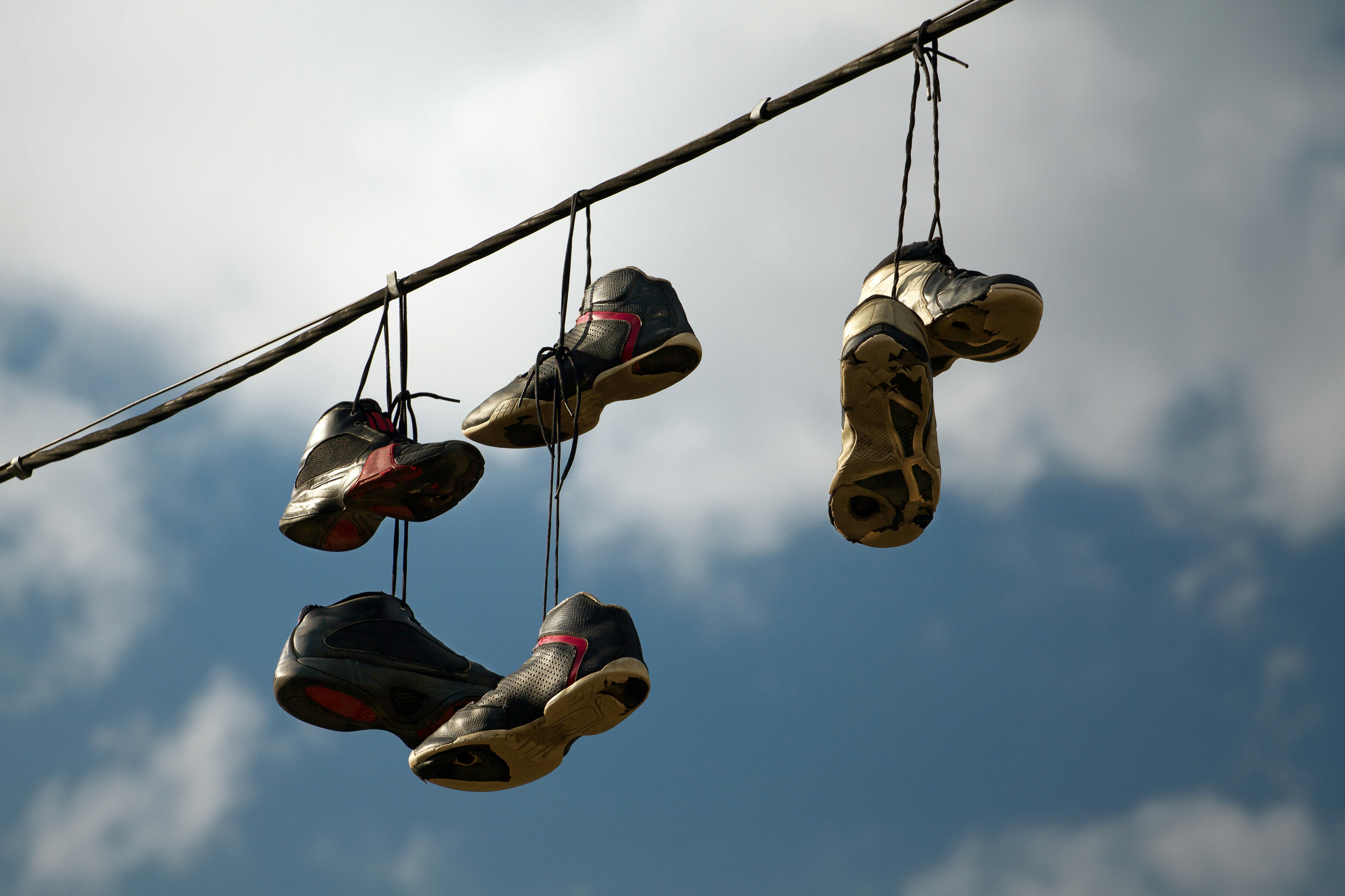 several pairs of shoes hanging from a wire