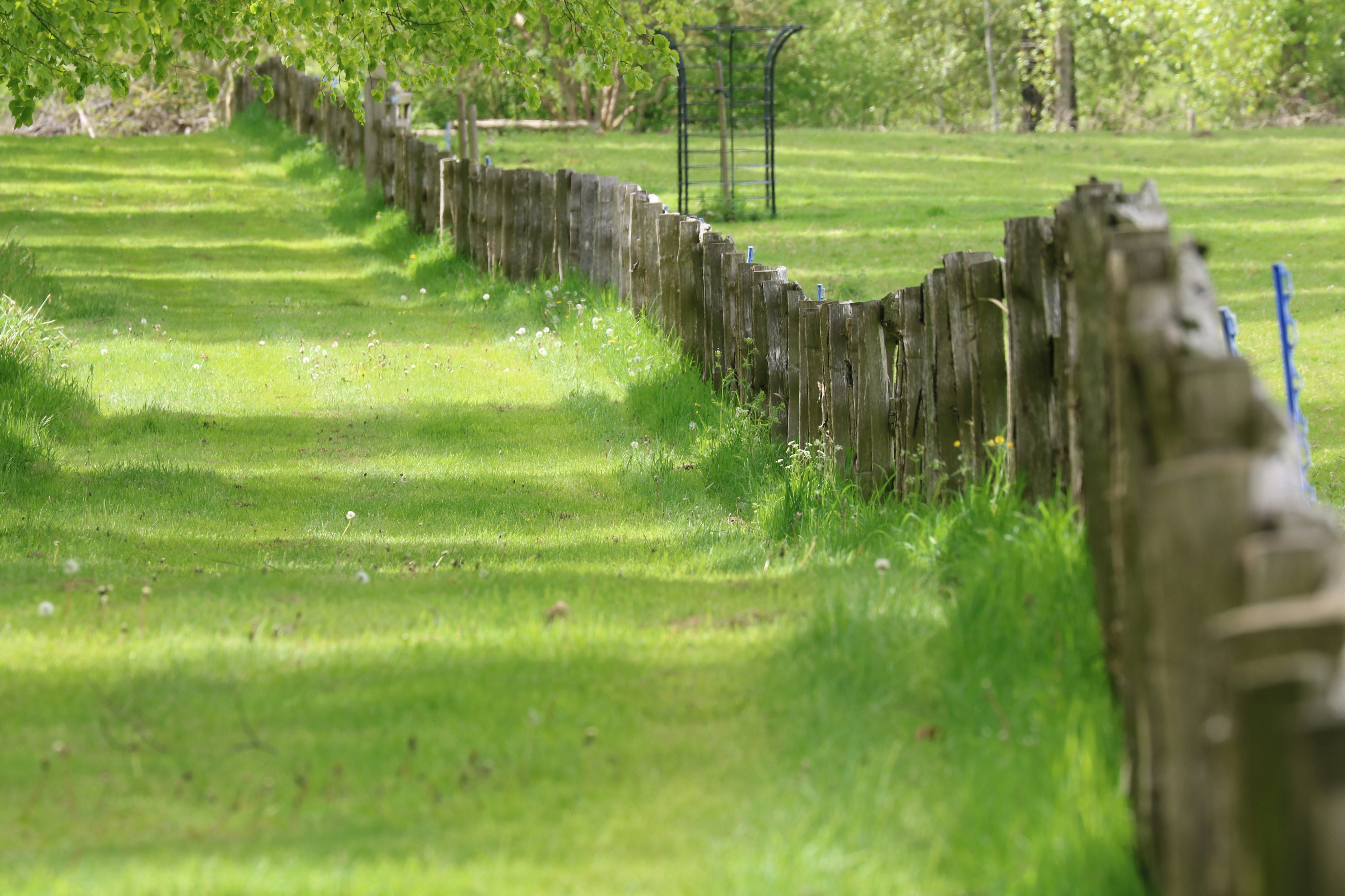 green grass field with brown wooden fence