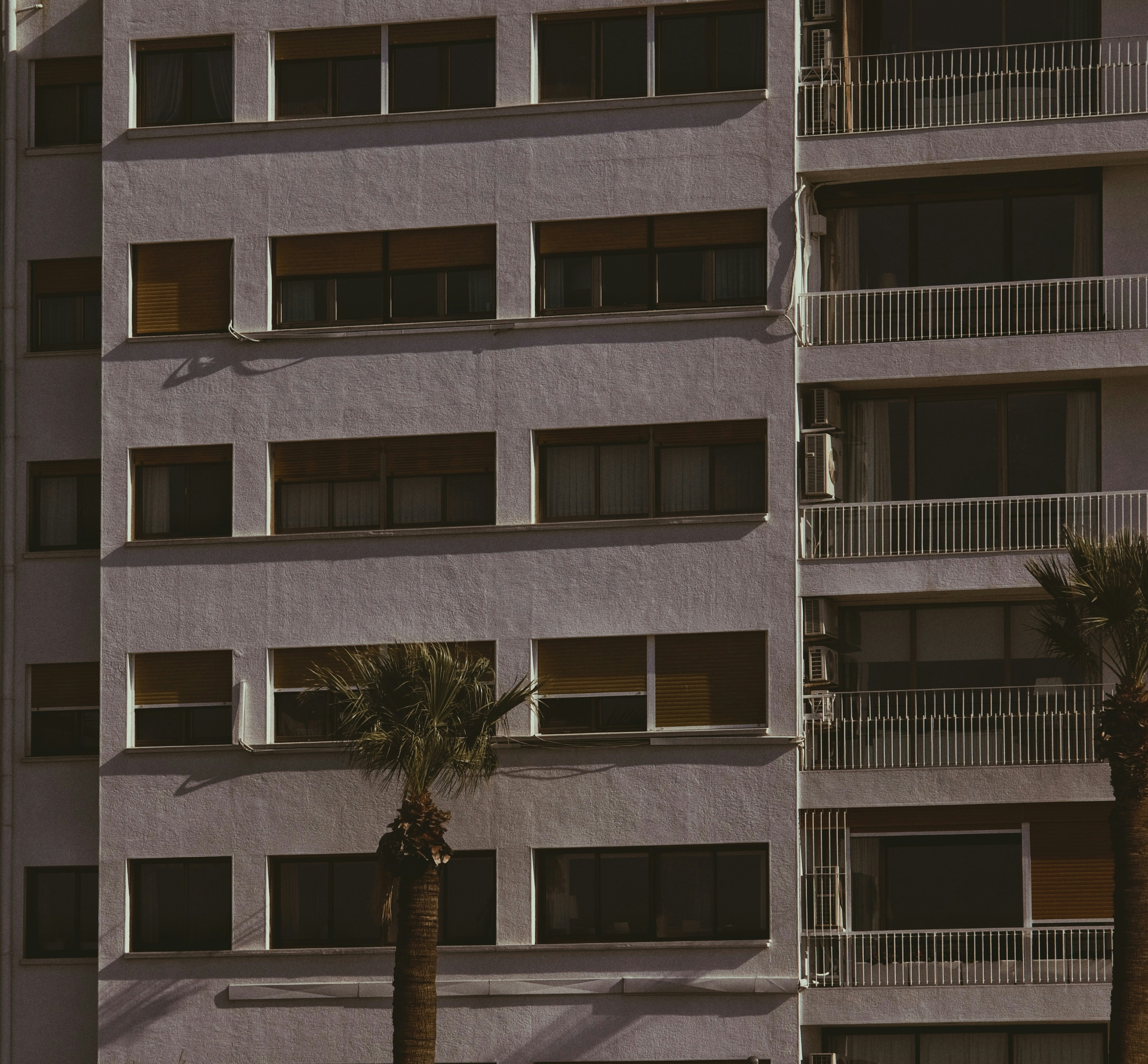 a tall building with palm trees in front of it