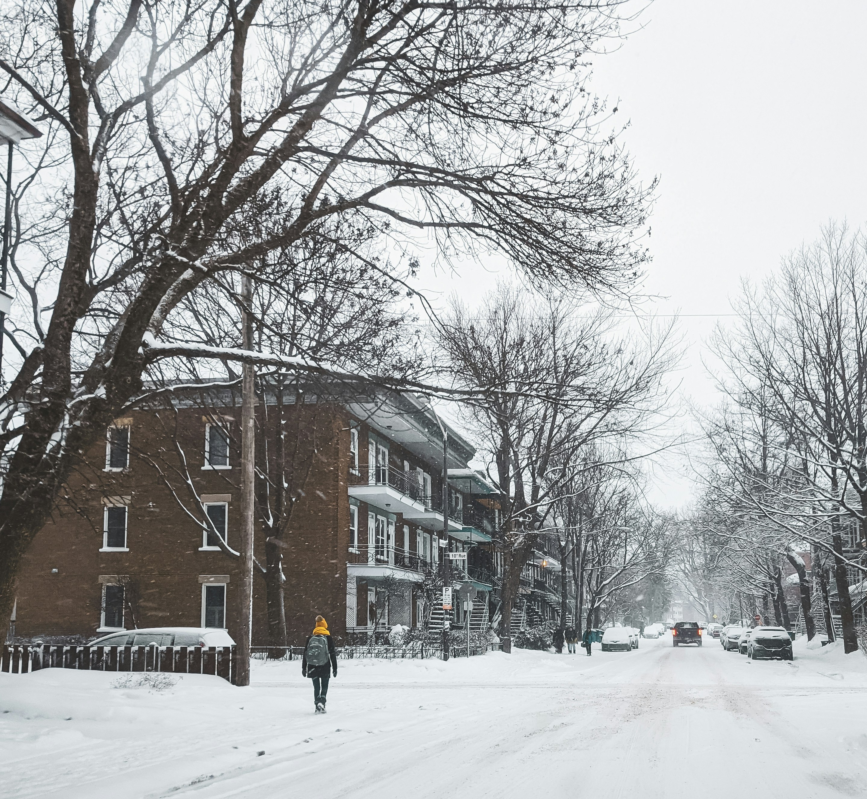 person in black jacket walking on snow covered road during daytime