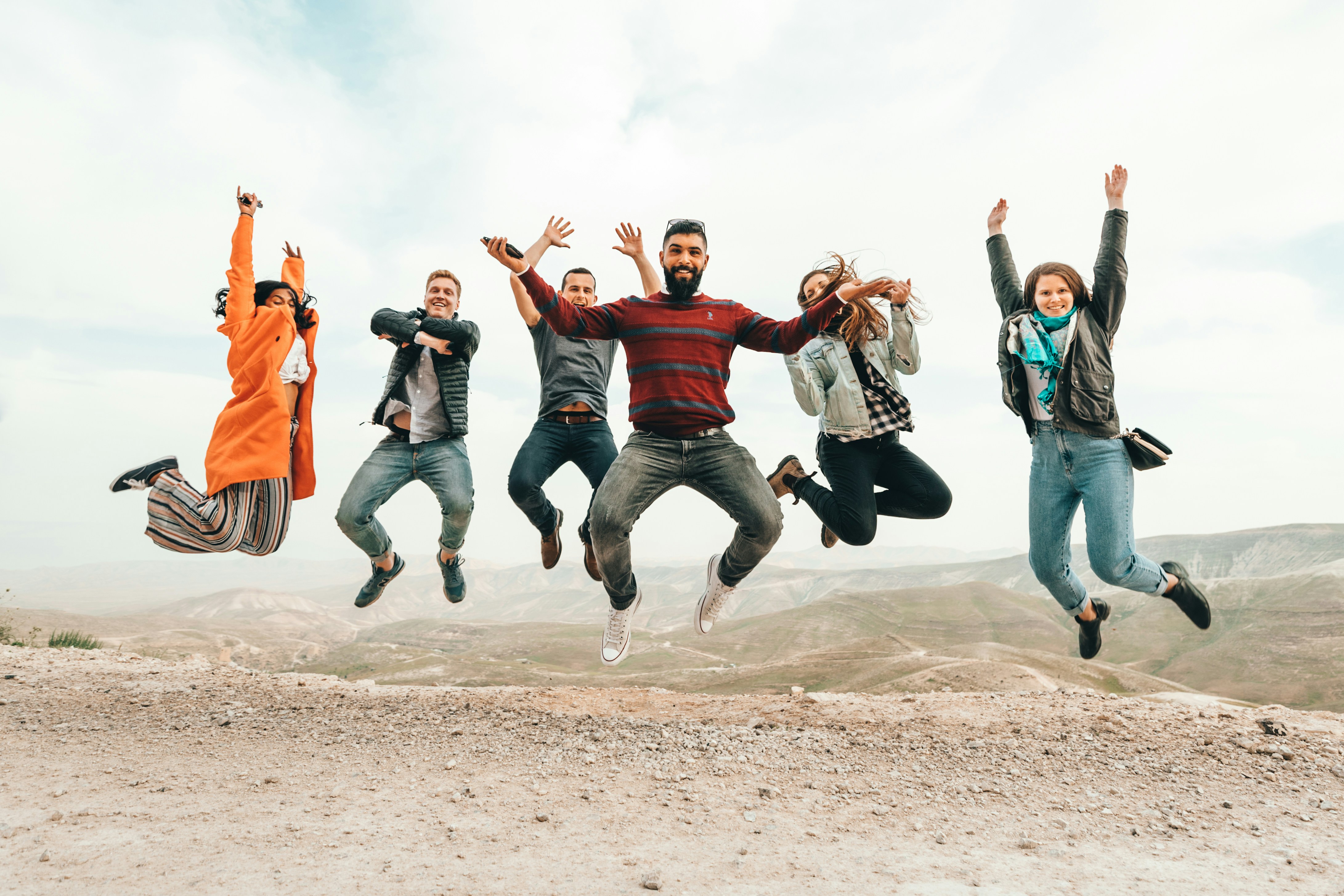 six group of people jumping on hill